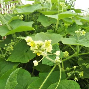 アレチウリ😀 川沿いに、はびこっているのは、アレチウリとクズです。 どちらも大きな葉で、1枚で掌より大きかったりします。 少し前まで、同じ植物かと思っていました😅 クズの花は紅色できれいですが、アレチウリの花はとてもささやかなものですね🎵 1枚目