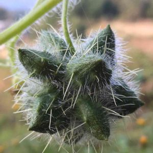 荒地瓜。侵略的外来種ワースト100に名を連ねる、いわば「植物のギャング」。圧倒的な繁殖力で覆いかぶさり、他の植物への光を奪って枯死させる。いまや全国に拡散して、猛威をふるっている。その果実。見るからにトゲトゲしく、鳥も食べないが、落下した種子を食べ、拡散しているようだ。類は類を呼ぶとはよく言ったもので、花に誘われてくるのはスズメバチで、うっかり繁茂したアレチウリを抜こうとすると、スズメバチに襲われることになる。北アメリカが原産と知ると、「むべなるかな」と思ってしまう。