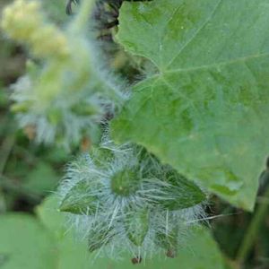 アレチウリの雄花 雌雄異花で、同株。 雄花は花序が長い。 雌花は花序が短く、球状。