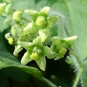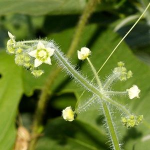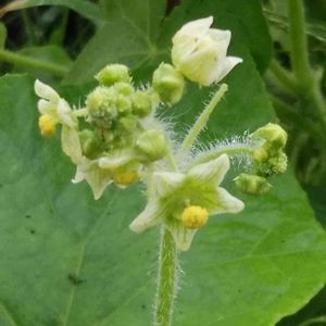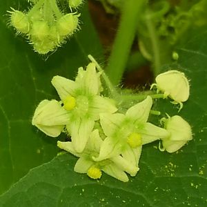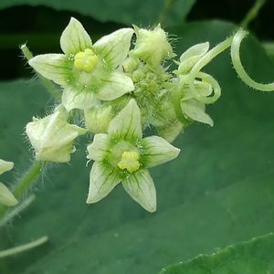 ♡アレチウリ♡ 名前のごとく、荒れ地や河川敷、路肩、藪など群生して蔓延っています😣 今朝センニンソウを撮りに行った所に群生していました🎵 茎にも葉っぱにも細かい刺が沢山付いています! これは花が球状になっているので雌花ですね⭐ 可愛い花ですね🎶 ウリ科とありますが、果実は硬い緑色の金平糖の様な物に成りますよ✨