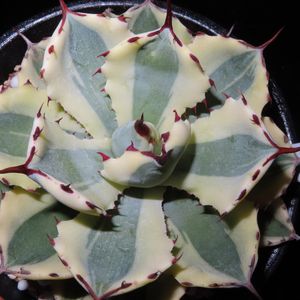 錦の日🏷もう一枚参加させて下さーい😁 アガベの錦さん達💖 先月の強風で棚が倒れてしまいかなり痛みが目立ちますが…😅💦 アガベさん達の鉢は大きく重たいので棚が耐えられなかったみたいです💦 今は分散して置いてます😁 右・姫笹の雪 真ん中、上から王妃雷神錦 ロファンサ アメリカーナ 五色万代 左、上から マンガベ・マチョモカ スーパークラウン アメリカーナ 白閃光