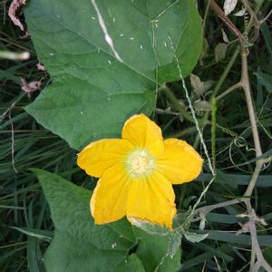 少し前に延びて来てるのに気づいたけど 植えてないので鳥🐦が落とした? レンズ先生「ペポカボチャ」 今頃花が咲いても実になるの?🥴