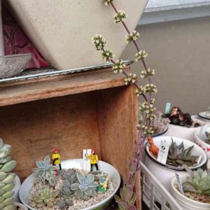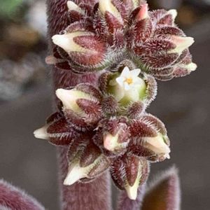 モケモケ多肉のフェルグソニアエのお花、ようやくひとつ開き始めました❣️ 団体さんが咲き揃うまで見てみたい‼️まだまだ頑張ってもらいます✊ 花茎は35センチのノッポさんです。 蕾を覆う部分もモケモケ💕