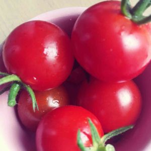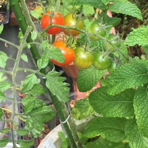 おはよーございます😊 この時間はまだお花いじり心地いい〜 今朝の収穫🍅アイコさん 日差しで葉っぱが枯れ枯れで ほとんど茎状態の情けない感じに なったけど実ったアイコさんは 元気の様です👍