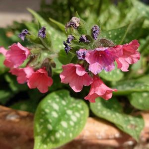 プルモナリア ラズベリースプラッシュ 赤花のプルモナリアの斑入り葉っぱをアネモネとバーバスカムと寄せ植えにしてます💕