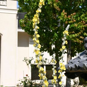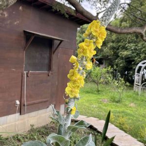 💛バーバスカム・ポーラサマー💛 高さは230cmあります😃 バーバスカムの仲間の中では最大でしょうね😊 花壇の中に植えていますが、飛び抜けて大きいです😅 イギリスのイングリッシュガーデンにはよく植えられていました☺️ 日本でよく見かけるビロードモウズイカはこの仲間のようで、よく似ています😀