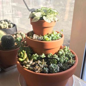 GSさんが段々の可愛い鉢をリメイクしていたので、私も今日作ってみました(∩´∀`∩)💕 前に多肉植物を育てていたので、葉挿しから育てた物をかき集めて寄せ植えしたので、ほとんど小さな苗ですが、出来栄えはまぁまぁかな〜楽しかったです( ⁎ᵕᴗᵕ⁎ )♡