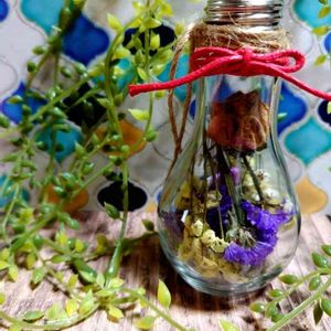 もうひとつ、1日違いの誕生日のお友達へのプレゼント🎁 100円ショップで購入した電球の形をした飾り瓶にドライフラワーを詰めてみました。(❁'ω'❁) 置いてもいいし、吊り下げてもいいように麻紐を付けました。 作るの楽しい〰(*Ü*)ﻌﻌﻌ♥ これからも、花や植物で色んなものを作ってみたくなりました。 "(ノ*>∀<)ノ