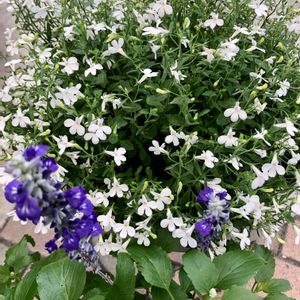 ロベリア•*¨*•.¸¸♪ ホット このロベリアは、暑さ、雨にも強い品種ならしく、スッキリしない天気の中、本当に🌿も根本まで元気✨ ブルーサルビアも花穂が次々上がってきました‧✧̣̇‧( ˙ ˙˵ )♪