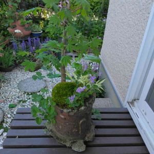 こんにちは~🤗 今日は暑いでーす😊 もみじ少ししなやかさが欲しいな~😆 苔とミニギボシ、タツナミソウだけ見て🤗…… この植木鉢は登り窯の立杭焼のさやです。