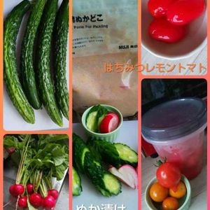 きゅうりとラデイッシュ頂いたので😆ぬか漬けにした🎵 夏に、ヘビリピで作る『はちみつレモンミニトマト』 畑のミニトマトは日照不足で、なかなかたくさんは色付いてくれない…😅だから野菜の直売所で買ったアイコで作ったけどね😝