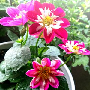 ダリア(スターシスター)です。 三色が入ってコントラストが美しいです。
