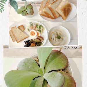 ★デザートローズ(唐印) カラコンエ属 なんとか今は成長してくれてる💕 今年こそは枯れず育って欲しいな 今日はこの子を見ながらモーニング🌈 ★里芋食パン🍞&おかず ★豆乳スープ 今日も皆んなにも良いことあるよ🍀 思うだけでたくさん舞い込む舞い込む👍 今日も行ってらっしゃいませ👋