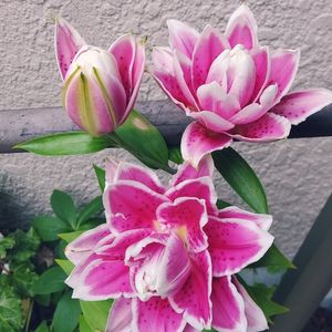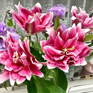 昨日、素敵な切り花のユリが半額になってました、ラッキー🎶💗 白と濃いピンクの八重〜初めて見ました😍 とっても華やか〜あなたのお名前は?✨💕
