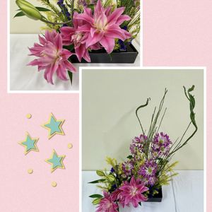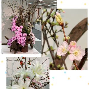 こんばんは✨ 昨日の続きで、川崎に行ってきました。 咲かない桜🌸のプチ技をひとつ。 日本酒加えると良いそうです💕 暖房入れた部屋で3日間経っても咲かなかった先生の桜。 昨日いける前に他の先生から聞いて、大きな枝だからワンカップ入れましたが、今日結構咲いてました😳 プチ技で、金曜日の蕾たちに参加させてくださいね💕 下はお友達の作品ですが、八重の百合初めて見て可愛いかったので🥰