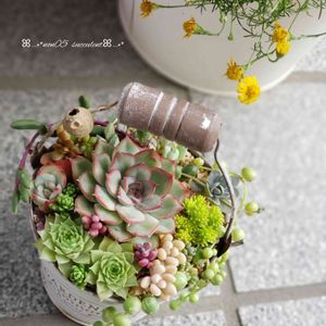 こんばんは🌜 お休みなのでもう一枚part3 昨日作った寄せ植えです♬ 可愛い系で纏めてみました(,,^_^,,)♡ すぐ水やりしちゃうので いつまでこの可愛さをキープ出来るか 多肉チャンと勝負です(⁎˃艸˂⁎)ププ 飛んで行った後の泥蜂🐝の巣も 壊さずにコーディネートしてみました(◍˃ᴗ˂)ァ,、♡