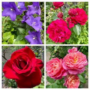 ☀️☁️☔️今日の庭33℃😱真っ赤なルージュとブーツを思い出し💧💜偲ぶ程に胸の痛みが😥☂️マークがずっと続いて梅雨明けはまだ遠い? ↓→ キキョウ ベルサイユのばら ルージュピエールドゥロンサール クロードモネ