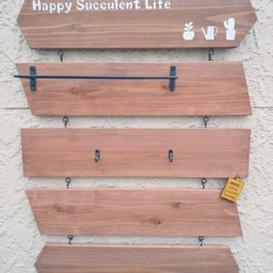 ⋆.°✩.Happy Succulent Life.✩°.⋆ 先日 作ったディスプレイボードに、ペンキで書いてみました✧*。٩(ˊωˋ*)و✧*。棚・フック・クリップも付けてみたよ🎶