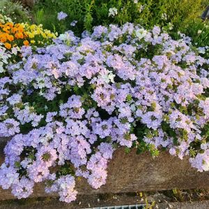 PWスーパーベナ アイストゥインクル💙 地植えの3年目😆🎶たくさん咲いています✨️ どこまで広がるか観察中🎶なんて言ってたけど、周りの植物を飲み込み始めた!😨のでちょっと切ろうかな😅✂️ 小さなポット苗からよくぞまぁこんなに大きくなって😳見るたびに感心します✨