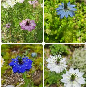 我が家のニゲラ達が咲いて来ました✨️ 花咲か爺さんのように種を撒いて回ったので、いろんな所にポツポツ咲いています😆🎶 3色の種を混ぜてばらまいたつもりだったけど、混ざって生えなかった😅 やっぱりこの花は不思議な形で綺麗ですね~😊💕