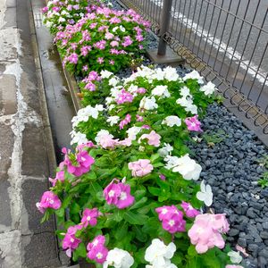 会社玄関前 こぼれ種〜ニチニチソウ 暑さに負けず、もりもり咲いています