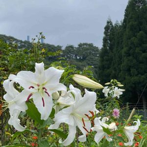 今日の我が家の花畑、カサブランカの咲く景色‼️ 白いカサブランカは7株、色とりどりの百合達は 20株ほど.庭や畑で咲いています。 まだ鹿の子百合や、鉄砲百合が咲いてません‼︎