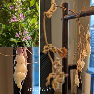 ‘’ チョロギ ‘’ 昨年~チョロギの正体を知って…興味津々‥👀 モンチッチおばさんが、畑にあったチョロギを抜いて、私に見せてくれたのは昨年の夏‥(^^)🎶 その捨て置いたのを~もらってプランターに植えて…今年は3本に増え、真夏にシソのような薄紫の花が咲いた‥👍 今は、枯れた茎と縮れた葉っぱが残っているのが2本と、緑の葉をつけているのが1本‥…(2枚目pic) 横になっているのを引き抜いてみたら~白くネジレタ可愛らしい巻き貝みたいなのが連なって出てきました(3枚目pic)‥💕 ヤッタ―~ヽ(=´▽`=)ノ!! お節の黒豆の上に乗っかってる~赤い巻き貝みたいなアレ~~~👀!! 畑で出来ていたんだネ~~~😉🎶 このままお正月にくる息子夫婦や孫たちに見せてあげようと思います~デモ、ちょっと試食… シャキシャキして、味も無く~舌先に少し辛味が残る感じかな‥🤔!? チョロギ(シソ科) イヌゴマ属
