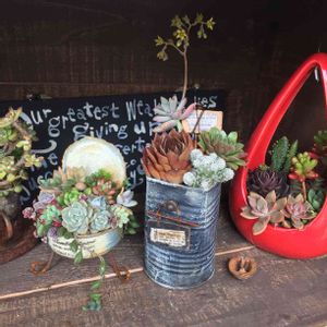 わが家のmaiちゃんのリメ缶たち 大集合〜✨✨ とろりんちょも看板も猫脚もあるけど 2段になってるリメ缶がないの😂 また作ってほしい🌟 maiちゃんの作品のお陰で 多肉LIFEの楽しさが増すよ〜😄 ありがとね〜💕