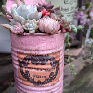 😊1月にカットした多肉達、根っこ出てきたので寄植えに🎵 だから綺麗なコは入ってナイ~😅 寄植えもなかなか上達しナイ~😅 1つ入れる度バランス崩れて💦😰ムズカシ〜 🎵出来立てのリメ缶に🎵