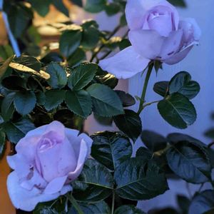 こんばんわ☆ ブルーバユー咲いてきたのに、とっても風が強くて、軒下に移動しました〰️ 花びらが散らないうちに、パシャリしました。 薄いパープルなのですが、夕方だったので色が出なかった💦