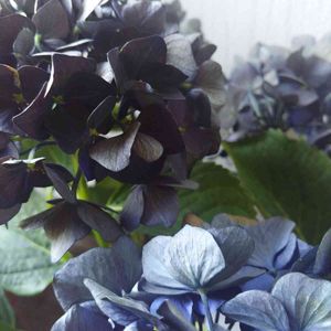 紫の紫陽花 奥深い円熟味のある花色に一目惚れしたこの紫陽花。 うちに来てくれて、今日でちょうど2ヶ月。 手前のは少し退色して青っぽくなり、奥側のは、さらにディープな色合いになってきました。 同じ株からの姉妹でも、個性が出るのかしら? もうしばらくこのまま楽しませてもらっていいのかな??