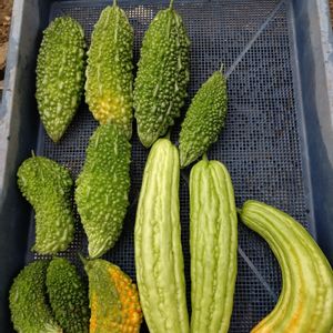 おはようございます 今朝の収穫🤗 ゴーヤ、👊😆🎵ってますよ 孫蔓❓️ひ孫蔓❓️で地面に寝て育ってるのは、小さめで虫のご飯になりつつあるので、早めに✂️ やっぱり、ゴーヤはぶら下がって育つべきなのね😃 🌱ゴーヤはうすあげと炊くわ 🌱完熟ゴーヤは、ジャム用に冷凍保存かな❓️😁 🌱サラダゴーヤはポテトサラダに入れようね 🌱オクラはそうめんつゆに漬けようね😃 🌱ネギは刻んでパットに保存🤗