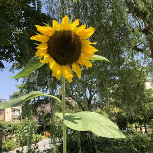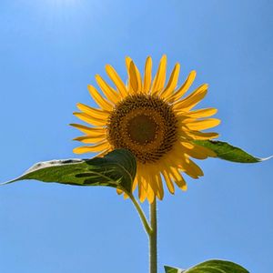通りすがりに ヒマワリ(向日葵)を見かけました😊 夏の青空の下 元気に綺麗に鮮やかに咲いていました😄 2024/08/10(土)撮影 2枚添付(スマホの画面を 指で 右から左にスワイプ(動かす)してくださいね🙇)