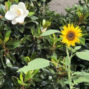 ヒマワリとタイサンボクのツーショット🤍💛 昨日の出勤途中の小さなスペースで会えました😊嬉しくてニヤニヤしながら歩いちゃって変な人だったかも😅 2️⃣ ちょっと距離はあるけれど、ツーショットね☺️😊 3️⃣ タイサンボク🤍前の日に蕾を見つけて、期待通りに咲いてくれていました🤍 4️⃣ 帰りには、タイサンボクのお花は少し周りが茶色くなっていました。 一日中隣り同士で咲いていて、なんだか朝よりヒマワリが🌻タイサンボクの方を向いているように感じちゃいました🤍💛