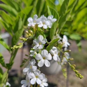 おはようございます😊 デュランタアルバ ホワイトラブ🤍 満開になってきました✨ 数年前に成長点を間違って切ってしまったので 放射状にパラパラと咲いています😅 2枚目はフライングソーサーの蕾🌱 少しずつ大きくなっています🤗 茶色く枯れてしまうのもありますが💦 3枚目はミニダリア❤ 暑くてなかなかきれいに咲かないけど この子はきれいな方です✨ 今日も1日元気に過ごせますように🥦