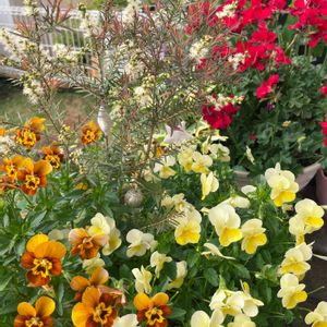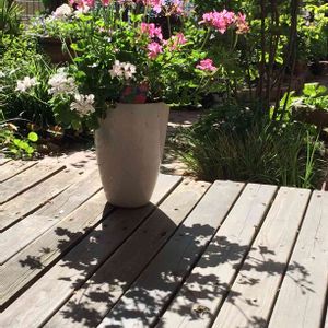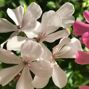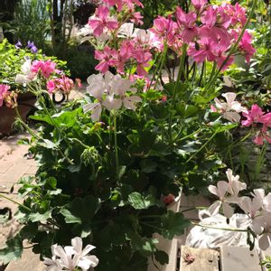 玄関前の板壁ガーデンです🏠 ①アイビーゼラニウムのトムキャットが開花しました️🖤 赤黒、八重咲きでお気に入りです。 ②ゼラニウムのマルカダホワイトです。 中央のピンクラインがステキです😍 ③ミニバラのボルドーコルダナ🌹 ボルドーではなく真っ赤なバラでした。 ミニつるバラの夢乙女も満開です🌸