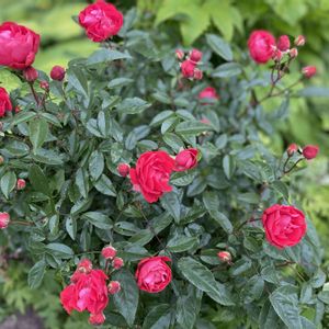 ポリアンサローズのマザーズデイ🌹 濃い赤色でコロコロとした蕾をたくさんつけて次々と開きます🌹 とても強いバラなんだそうです。 シュートが伸び、つるバラのようにシュート途中から赤い新芽がたくさん出ているのでこれからが楽しみです💓