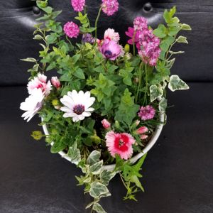 こんばんは🌙😃❗ 今年の寄せ植えNo.22 アルメリア イソマツ科 草丈5~40cm 開花期3月~6月 日当たりと風通しのよい場所で、育て、 土の表面が、乾いたらたっぷり 春と秋に、1000倍に、薄めた液体肥料を、月に1~2回与える。 オレガノブックランド シソ科 半耐寒性常緑多年草 日当たりのよい場所を好む植物ですが、夏は、半日陰の風通しのよい場所で、育ててください。 水やりは、表土が、乾いたらたっぷり与える❗ 過湿は、厳禁です。 冬場は、0℃を、下廻らない地域で、あれば、戸外での越冬も、可能。但し、霜や雪が、かからないようにする。 切り戻しをしたら、 秋まで、開花します。 ピンクの小花が咲く予定です。 オステオスペルマム 2色2苗、 撫子、1色3苗 ヘデラ、2種類 今回は、ピンク系の優しい寄せ植えに、しました🎵どちらから見てもいいように、しました❗ 落ち着いたら、後ろから、撮ってアップします🎵