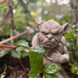 険しいお顔のガーゴイル 我が家の庭の見守り番です どの角度から見ても目が合っちゃう💦 手前のヤブコウジの葉に戦いの痕が!? 後方にはコルジリネの剣もあるw 色んな事妄想してたら蚊に刺された💦 守ってよ〜〜