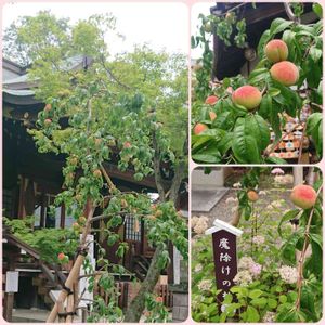 行田八幡⛩️ 魔除けの桃の木に、かわいらしい実がたくさん✨🍑✨ 病封じのご利益がある神社さんということで、疫病退散のお札?を配布してらっしゃいました(。-人-。)