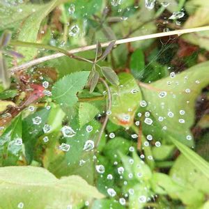 道端探し隊 トンボ自然公園 昨日の雨からの 朝露をまとった草達 キラキラが眩しいです スイバの花に掛けたクモの巣の糸も重たげ ナンジャモンジャも したの枝は露の重さに耐えかねて地に着いていました 今日も少し暑くなりそうです