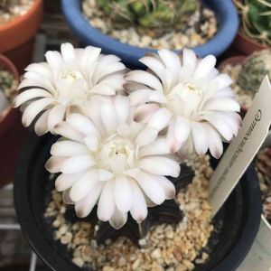 そうこうしてると、ギムノさんたちが花を開きたがってたので、南のウッドデッキに移動。 ミハノビッチさんは咲かない。 でも、牡丹玉(フリードリッヒィLB2178っぼい子)は咲いてくれました😉👍 真っ白な花、良いねえー🤗🎶🎶