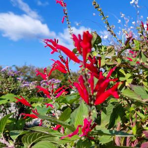 おはようございます😃 赤いパイナップルセージが 青空に映えます🔴🔵 トンビも気持ちよさそうに 飛んでました🪶 先週の園芸センターにて 素敵な三連休になるとよいですね😌