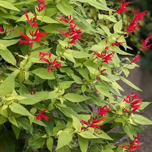 💚パイナップルセージ❤️ ゴールデンデリシャス✨ 鉢で育てていましたが植えにすると、株が大きくなって花数も増えました😊 北陸なので、冬はこんもりと雪をかぶっていますが🥶季節がめぐってくると、毎年元気にお花を見せてくれます💖