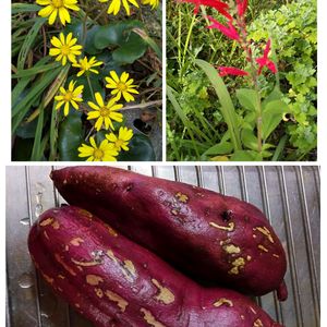 寂しくなった 庭を暖めてくれてる 華やかな色の ツワブキ と パイナップルセージ 寒くて縮こまった ハートを温めてくれる 旧友からの野菜便 サツマイモ あなたみたいに 栄養たっぷり🤗 美味しくいただくわね🎵