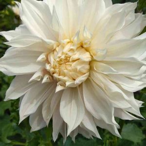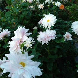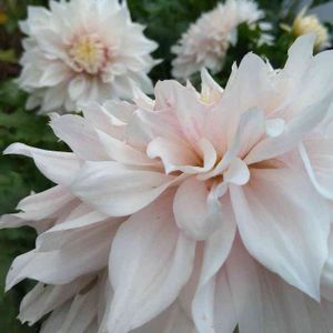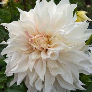 白い大輪ダリア🌼 咲き続けています🌼 球根はもう10年以上経っている古い球根ですが、 三年に一度掘りあげては 分けて植えているので たくさんの株があります🎶 ご近所さんにも球根をもらっていただきました😊 真っ白と淡いピンクが混じった二種類の白い大輪ダリアです🌼