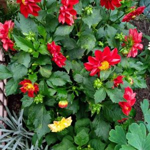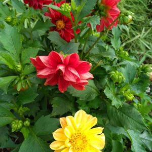 🍀おはようございます🍀 赤いミニダリアと黄色いミニダリア💕 赤の勢いが良くて淡いオレンジ色が入った黄色いミニダリアが窮屈そうに見えます🤭