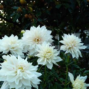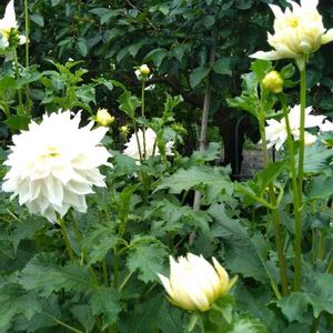🍀おはようございます🍀 柿の木の近くに植えている白い大輪ダリアがやっと咲き始めてきました🎶 以前picした大輪ダリアを掘り上げて球根を分けたものですが、 日当たりが悪いからか いつも開花が遅くなります😊 濃い緑の柿の葉っぱはワサワサになり付近一帯が日陰になっています💧