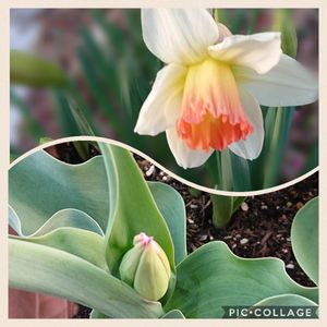 上↑我が家の今年初の口紅すいせん 咲きました😀かなり ごゆっくり😅(磯さん❓️さんに 名前を 教えていただきました🙇) 下↓ 葉っぱ🌱の間から 顔を覗かせた今年初のチューリップ🌷