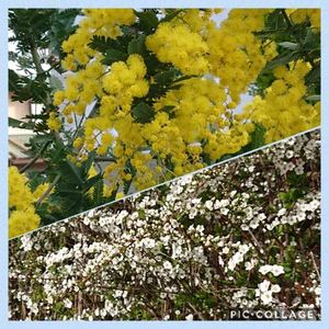 福の散歩中に 見掛けた ミモザと ゆきやなぎ 🤗 ワンコ🐶の散歩は こんな出会いがあるので 楽しいひとときです❤️